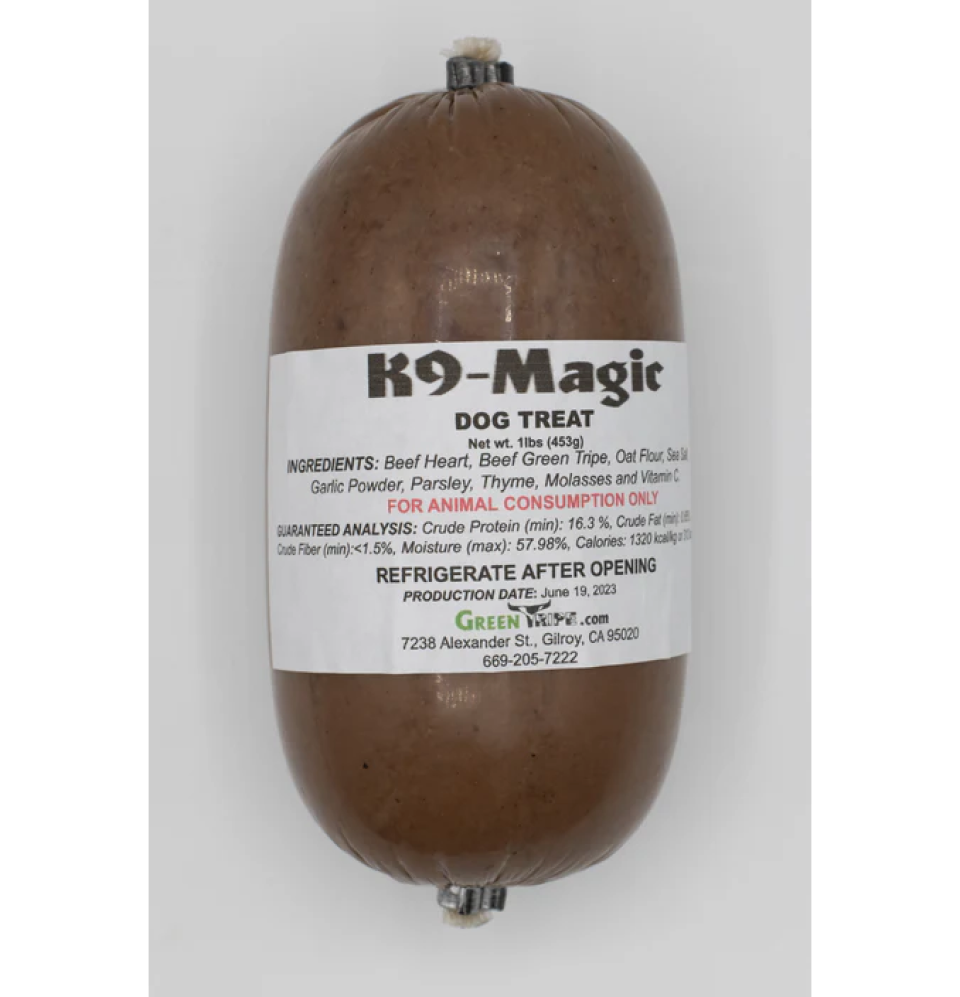 K9-Magic is a cooked training treat. It is made of muscle meat, green tripe, oat flour, garlic, thyme, corriander, and parsley. It is preserved naturally with Vitamin C and sea salt.