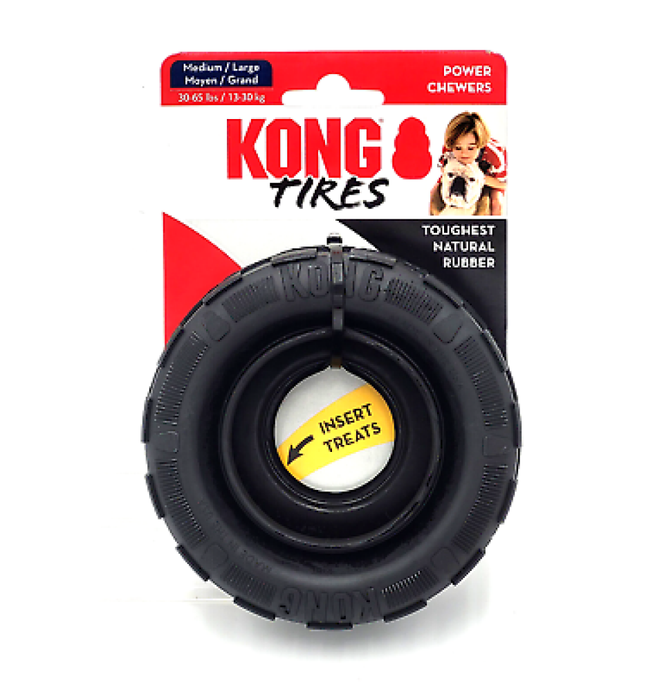KONG Tires is a durable tire chew designed to provide the ultimate chewing experience. The uniquely shaped sidewalls and thick outer tread create a super durable, elastic barrier. The sidewalls are designed to double up and rebound when compressed to provide an active chewing experience, and the Tires are perfect for bouncy games of fetch.