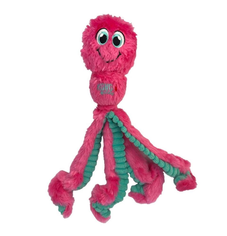KONG Wubba Octopus’ dangling legs and long, floppy body make him ideal for instinct-satisfying shaking. The squeaker prolongs play. Ideal for indoor tugging, shaking and fetching fun, this adorable undersea pal’s great for snuggling, too, thanks to his super-soft plush. Minimal stuffing for less mess.