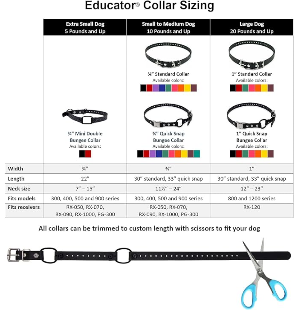 This collar is compatible with all FE-560, FT-330, PG-300, ET-300, ET-400, and EZ/PE-900 model receivers as well as the PG-300, Micro RX-070, RX-050, RX-090, BP-504 & RX-1000.