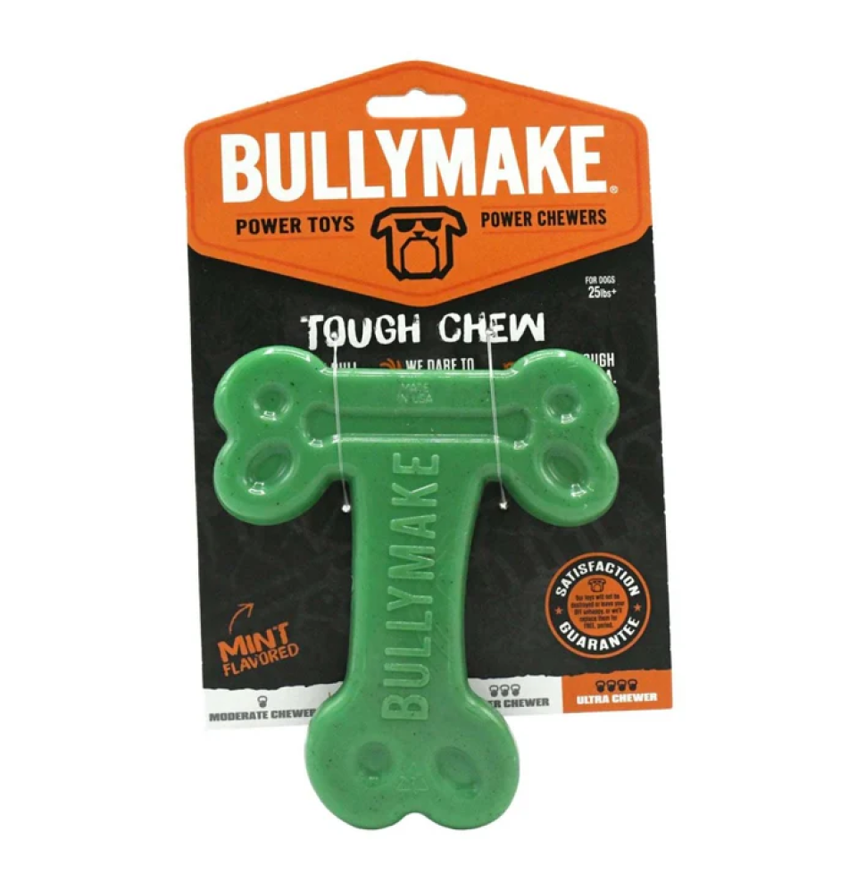 Keep your fur friend happy and occupied with the BULLYMAKE Nylon Green T-Bone Mint Flavor Dog Toy. The nylon construction offers long-lasting dependability, and the T-bone design adds another level of entertainment. The dog toy features a non-flat design making it easy to grip and chew, and it is mint flavored to help entice your pup's snout.