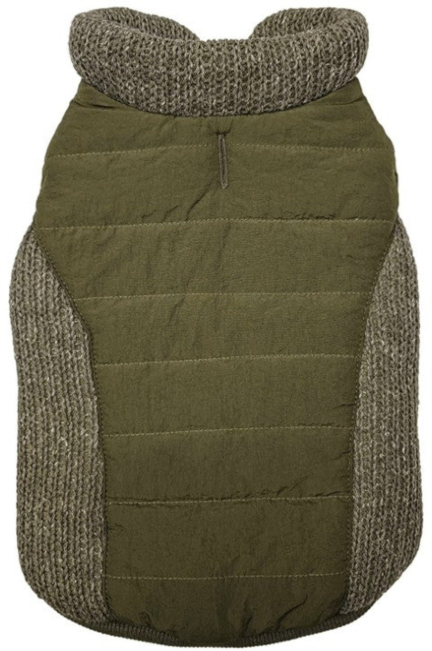 Fashion Pet Sweater Trim Puffy Dog Coat Olive. Sweater trimmed puffer coat that is reversible! 2 great looks in 1. High knit collar for added warmth. Warm cozy fleece on reverse side. Leash hole.