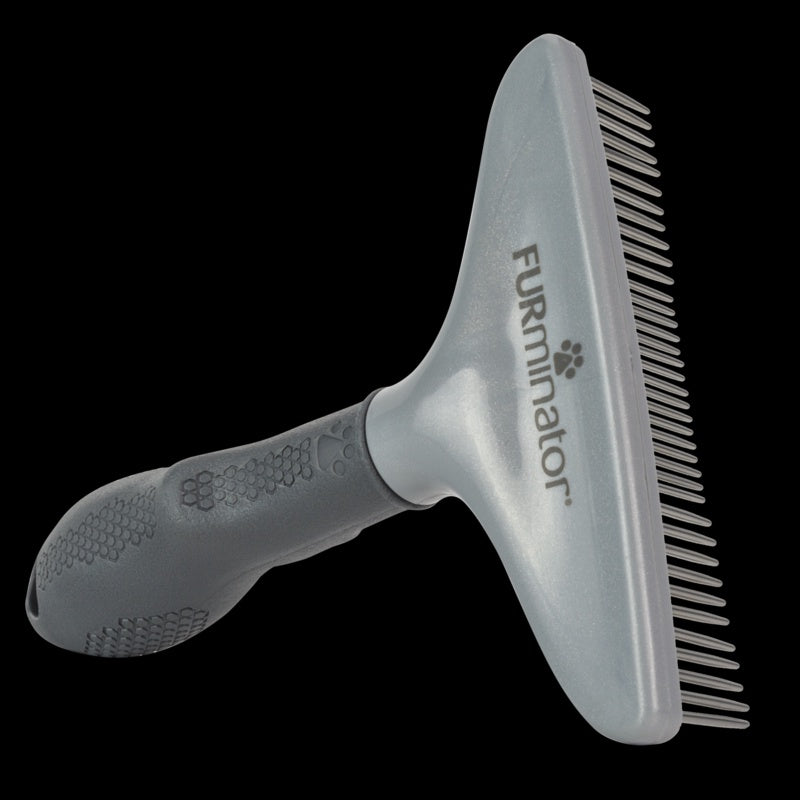 The FURminator® Grooming Rake removes loose hair from the undercoat and helps prevent tangles and matted hair, thanks to rotating metal teeth. It is ideal for dogs and cats with thick fur or dense double coats. The ergonomic nonslip handle of the FURminator® Grooming Rake provides maximum control while using.