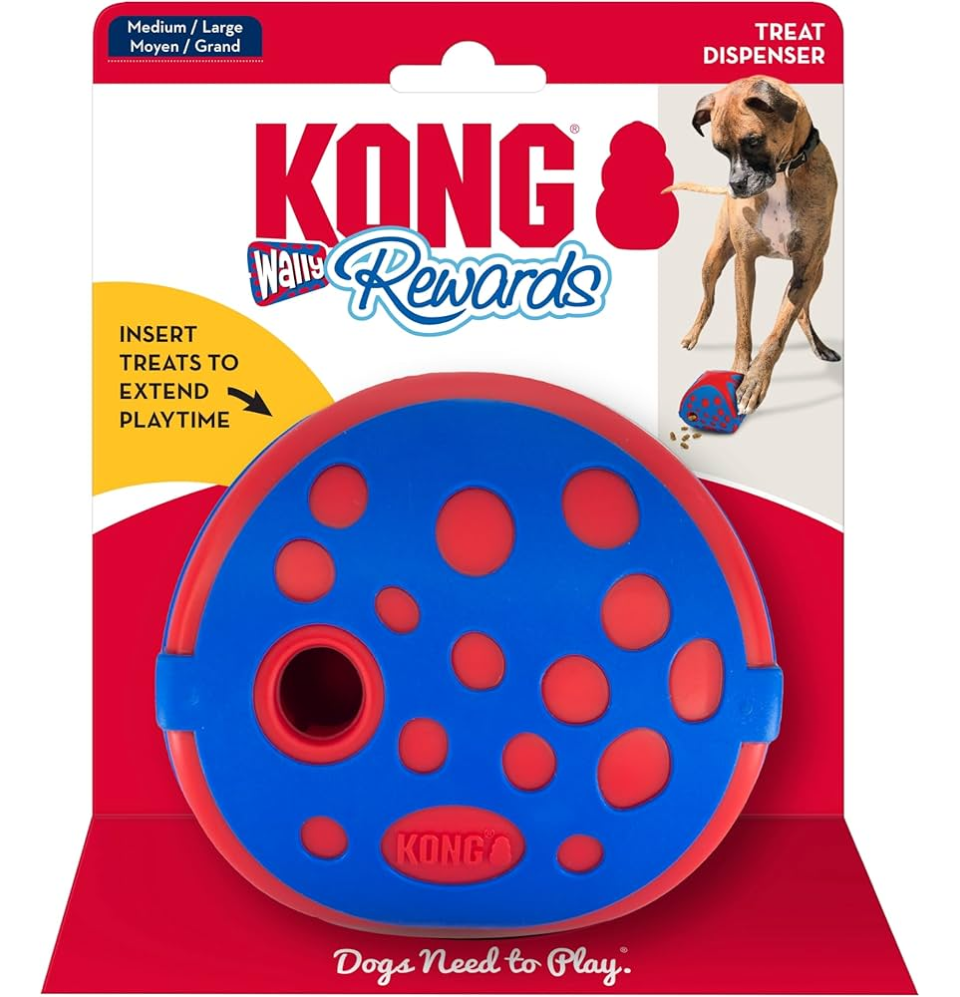 KONG Rewards Wally produces a slow and steady roll when nudged, gradually dispensing kibble or treats. The unique exterior creates an unpredictable motion, rewarding natural foraging instincts. The outer grippy material mutes noise for quieter play. Use this 1-cup slow feeder as a food bowl to help manage weight by extending mealtime. Unscrews easily for filling and hand washing.