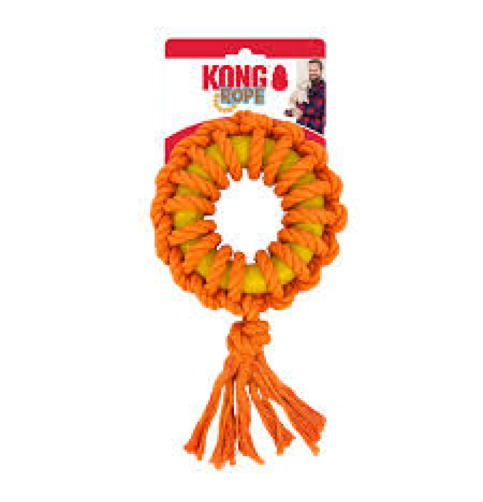 KONG Rope Ringerz deliver a double dose of chewing and fetching fun with two different durable layers to satisfy dogs’ natural chewing and fetching instincts. The knotted rope exterior makes grabbing easier to heighten the fetching fun. Plus, chewing on rope helps clean teeth and gums.