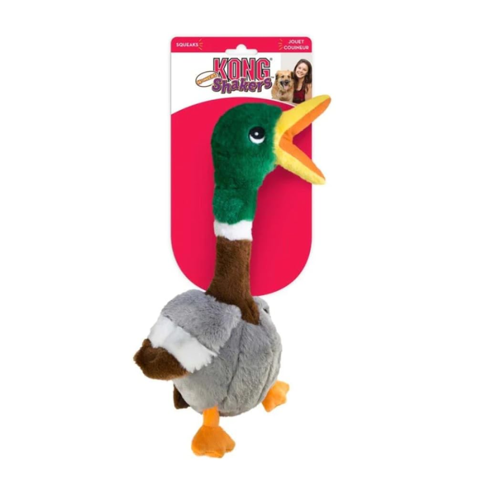 KONG Shakers Honkers Duck lets the fun fly with an internal neck which features a texture that satisfies a dogs’ natural chewing instincts while the long floppy legs spark shaking and tugging play sessions. KONG Shakers Honkers low tone squawk and the reinforced plush design keeps dogs tickled pink and playing longer.