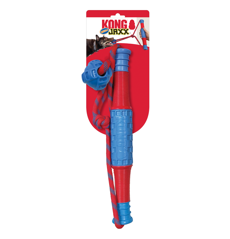 Jumbo-sized, durable fetch-and-tug toy with comfy handles for interactive play and a sliding ball that adds an extra dimension to tugging fun.