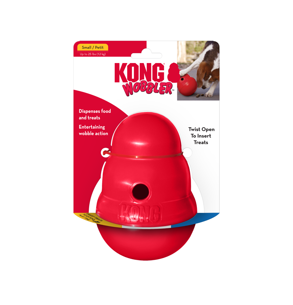 The KONG Wobbler™ is an action-packed toy that is a mentally stimulating food dispenser. The KONG shaped toy sits upright until nudged by the dog’s paw or nose, dispensing tasty rewards as it wobbles, spins and rolls. The unpredictable movement stimulates natural instincts keeping even the most seasoned users challenged. The KONG Wobbler™ can also be used as an alternative to a dog bowl to help extend mealtime while providing exercise for your dog. Trying to get your dog to lose a few unwanted pounds? The KONG Wobbler™ is a great way to keep dogs moving while making them work for their food. Unscrews for easy filling and cleaning. Use the large Wobbler™ for medium to large-sized dogs