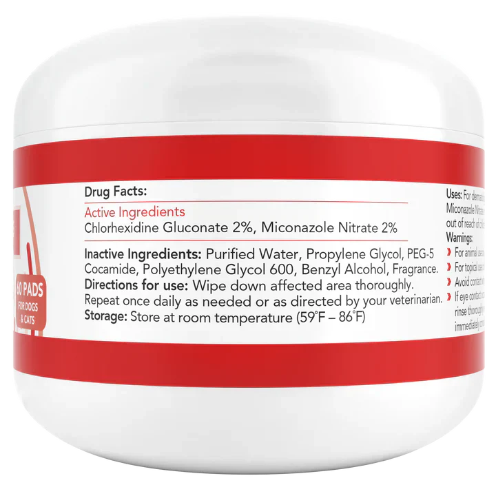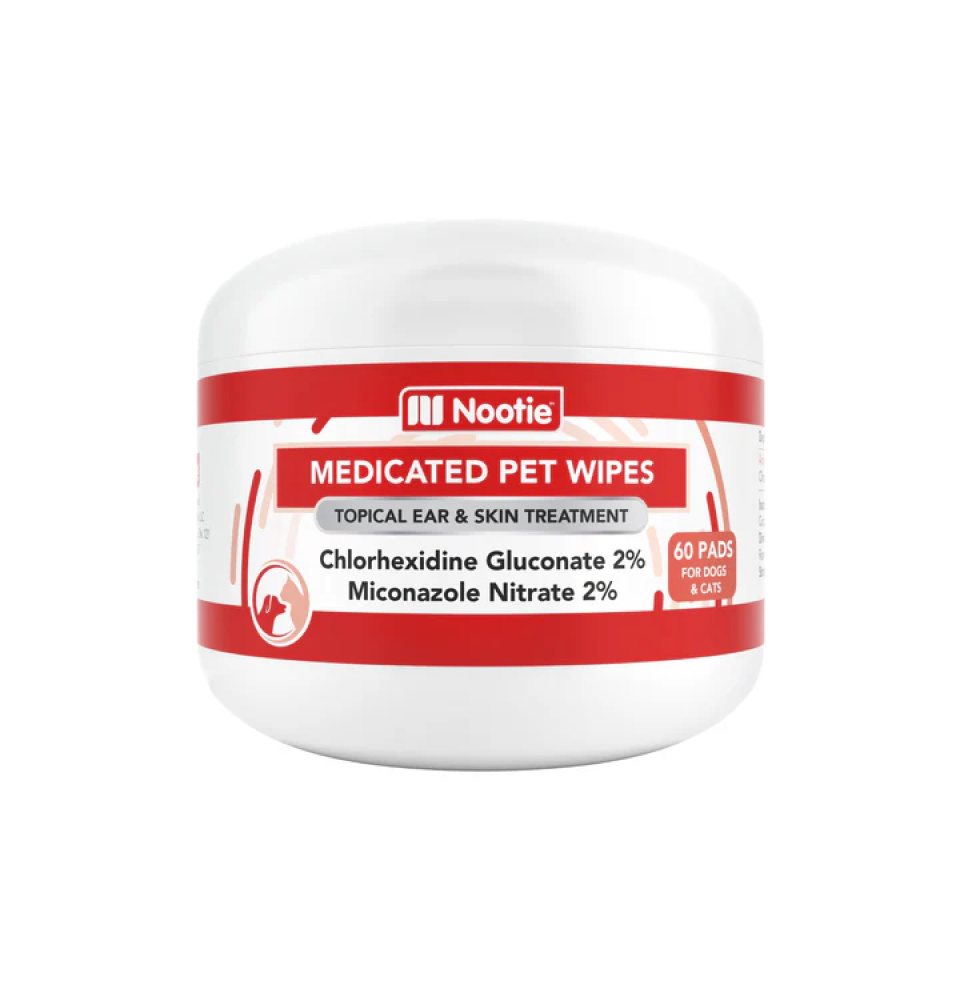 Nootie Medicated Pet Wipes for dogs and cats treats and relieves symptoms due to skin infections caused by bacteria, fungi, and yeast. These medicated pads use veterinarian strength active ingredients Chlorhexidine Gluconate and Miconazole Nitrate to help provide maximum results. Formulated with our delicate soft lily fragrance.