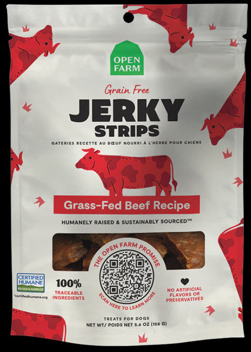 Open Farm grass-fed beef jerky strips feature certified humane beef to deliver an incredible taste your dog will crave! As with all Open Farm products, our ethically sourced, farm to bowl ingredients are 100% traceable. Our jerky strips are crafted in a way that respects animal welfare and our planet. Approximately 7-8 strips per bag.