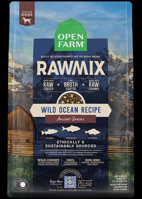 RawMix features our protein-packed kibble covered in a nutritious bone broth and freeze dried raw coating, with added chunks of cod freeze dried raw. Crafted with a blend of wild-caught whitefish, salmon and rockfish, this delicious recipe includes nutrient-dense meat and bone with non-GMO grains, fruits, and veggies.