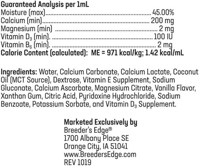 Ingredients: Water, Calcium Carbonate, Calcium Lactate, Coconut Oil (MCT Source), Dextrose, Vitamin E Supplement, Sodium Gluconate, Calcium Ascorbate, Magnesium Citrate, Vanilla Flavor, Xanthan Gum, Citric Acid, Pyridoxine Hydrochloride, Sodium Benzoate, Potassium Sorbate, and Vitamin D3 Supplement.