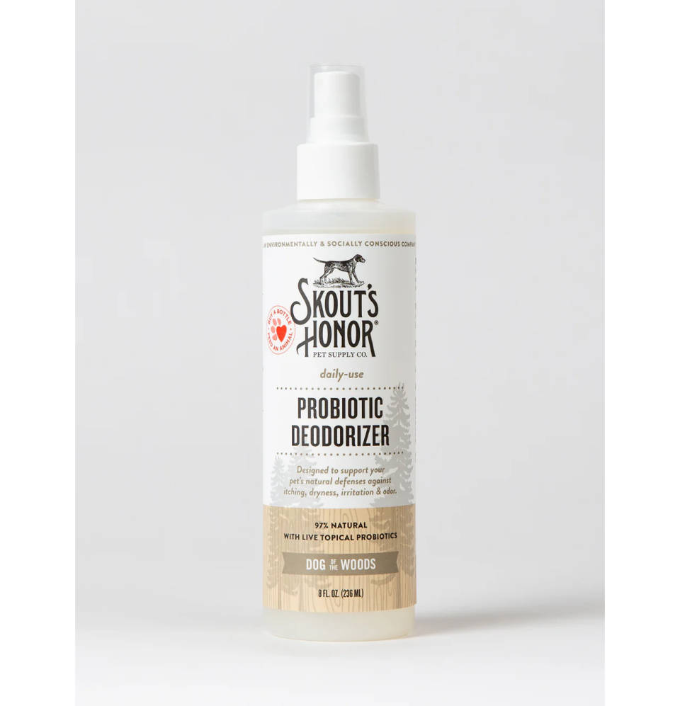 Skout's Honor cat and dog deodorizing spray hydrates and deodorizes the skin and coat for a fresher, better-smelling pet in between washes. It contains avocado oil and topical probiotics that help support a healthy microbiome to defend against common skin problems such as itching, odor, dryness, dandruff, hot spots, yeast and excessive shedding.