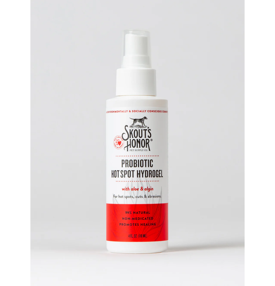 Soothe, heal and protect wounds, including hot spots, abrasions, lacerations, burns and irritated skin. Skout's Honor Probiotic Hot Spot Hydrogel adheres to the affected area to moisturize and promote optimal healing conditions with the natural benefits of aloe vera, hickory bark extract, alginate and topical probiotics.