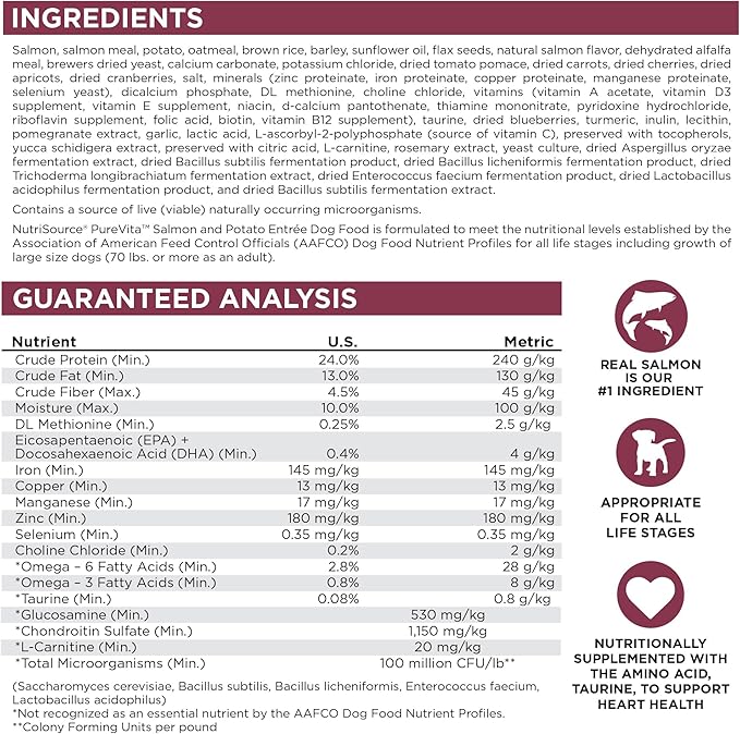 PureVita™ Salmon and Potato Entrée combines tasty salmon with wholesome potatoes and a select variety of nutritious fruits and vegetables to deliver a healthy and delicious, easy to digest meal your pet will love. PureVita™ entrées feature single source animal or fish proteins in a limited ingredient diet.