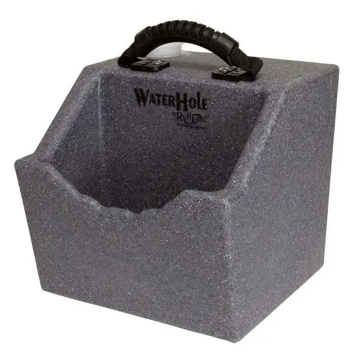 The Water Hole™ is a water container that holds up to one gallon of water that is stored in the tower side of the container yet is always available for your dog to drink. It works via a vacuum like an office water cooler. Simply fill it and as your dog drinks the water, that water is automatically replaced from the tower. Will not crack or break if water freezes. Durable roto-molded construction. Handy drain cap also makes it easy to rinse out.