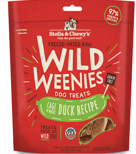 Stella & Chewy's Freeze-Dried Raw Wild Weenies dog treats are made with responsibly sourced ingredients in our own USA kitchen. Stella & Chewy's was built on a philosophy that feeding your pet a wholesome diet similar to what their ancestors enjoyed in the wild is the optimal way to help your pet thrive. These treats are ideal for pet parents seeking to add nutrition, reward their dog or puppy for good behavior, or entice a picky eater. With low carbohydrates and no fillers, legumes, artificial colors, flavor or preservatives, these recipes will feed your dog's wild side.