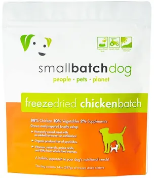 Small Batch Chicken Sliders are crafted in small batches with local ingredients to provide a wholesome diet for dogs. It features 88% chicken, 10% produce, 2% supplements. The meat is free-range, pasture raised and always free of hormones and antibiotics. Small Batch only uses 100% certified Organic fruits and vegetables and the supplements are always pure, organic, and unrefined. The ingredients are gently freeze-dried to ensure the nutrients are protected. No HPP (high pressure pasteurization), only freeze-dried raw ingredients. This recipe is proudly made in California.