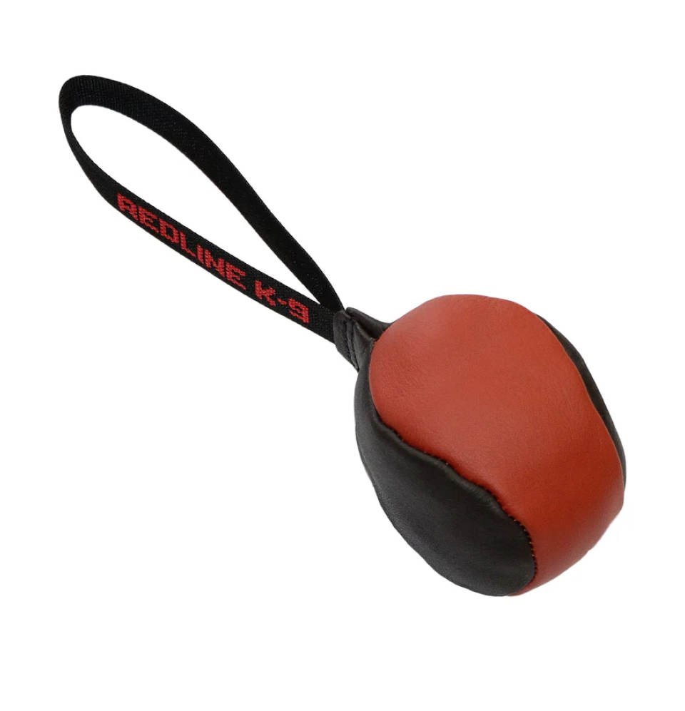 The Redline K-9 Soft Leather Reward Ball is made from our soft grain leather and finished with a sturdy nylon handle for throwing. This ball is designed to be a high value reward and is not meant for strong pulling or as a chew toy.