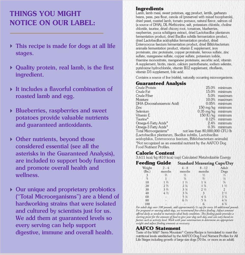 - Taste of the Wild Sierra Mountain with ROASTED LAMB dry dog food; REAL LAMB is the #1 ingredient; 25% protein to help support bones, joints and LEAN, STRONG MUSCLES