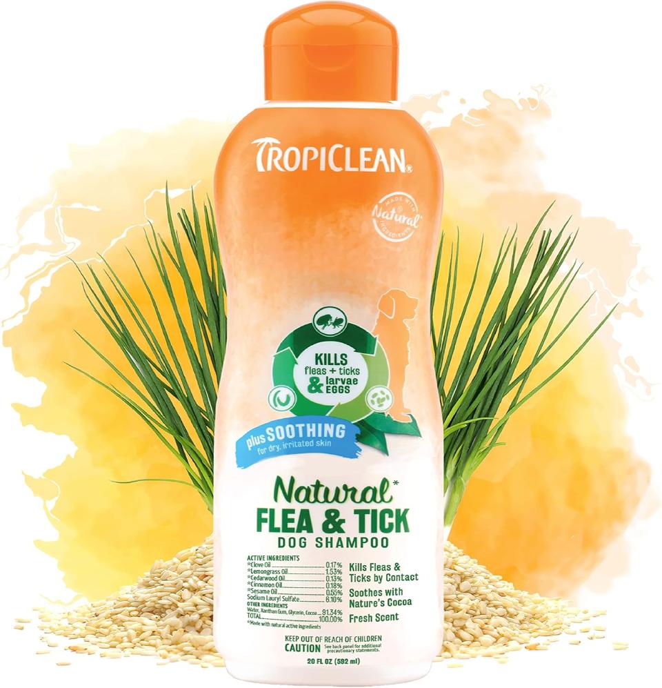 TropiClean Soothing Natural* Flea + Tick Shampoo kills fleas & ticks by contact. This natural* essential oil blend contains nature's most powerful pest fighting ingredients, maximized with lemongrass oil, cedarwood oil, clove oil and sesame oil, for long lasting effects. Cocoa butter provides soothing relief to irritated skin. Safe, when used as directed, for routine baths on dogs and puppies 12 weeks and older.