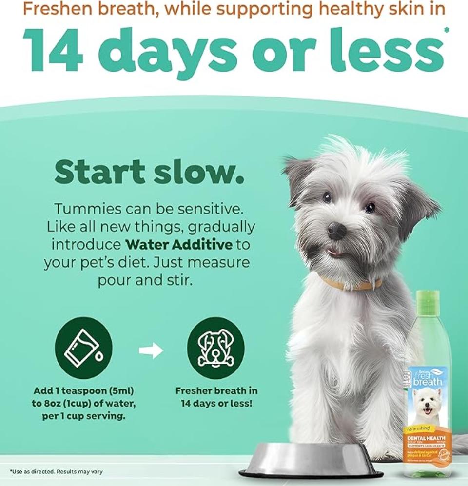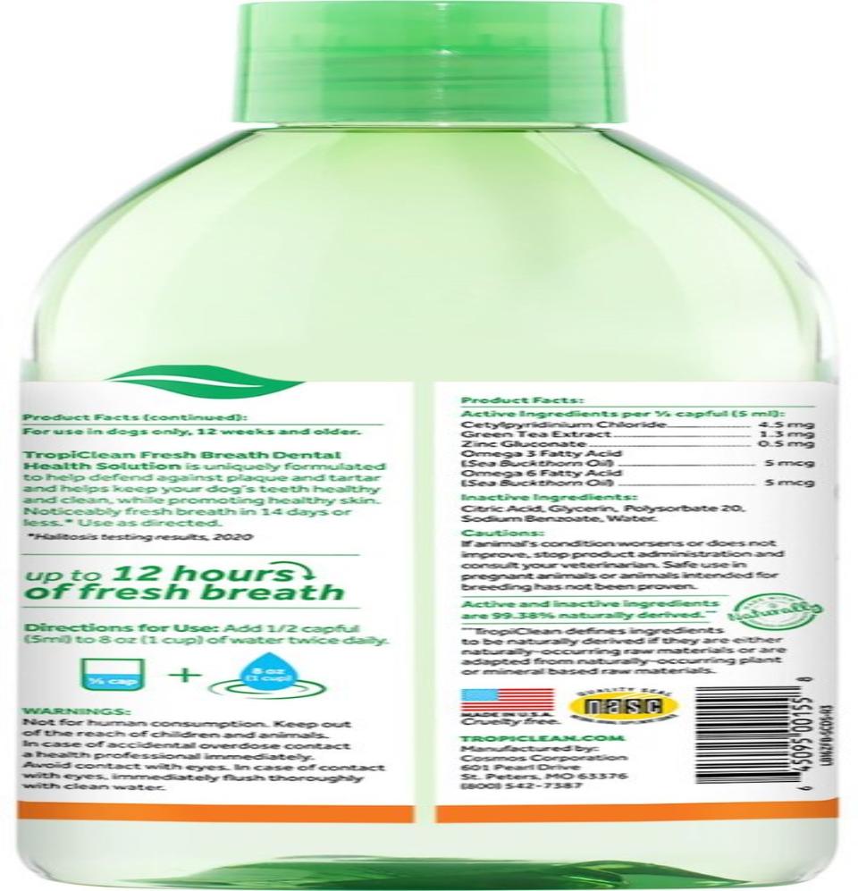 Cleaning your pet’s teeth is about more than just getting their pearly whites to sparkle – it’s an important step in their overall health and wellness. With TropiClean Fresh Breath Dental Health Supports Skin Health, dogs can benefit from daily plaque and tartar defense, simply by drinking from their water bowl. This special formula contains added omegas-3 and -6 fatty acids to help support healthy skin. Easy-to-use water additive gives your dog clean teeth and fresh breath—no brushing required!