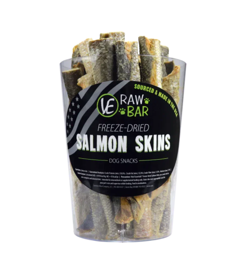 We use a slow freeze drying process on butcher cut salmon to seal in the naturally occurring Omega 3 Fatty Acids into an easy-to-serve salmon skin treat, great at any time of day. Treat your dog to butcher cut raw protein between meals for a snack that builds strong muscles for more play, naturally supports digestive and oral health, and provides essential nutrients to support your dogs vitality.