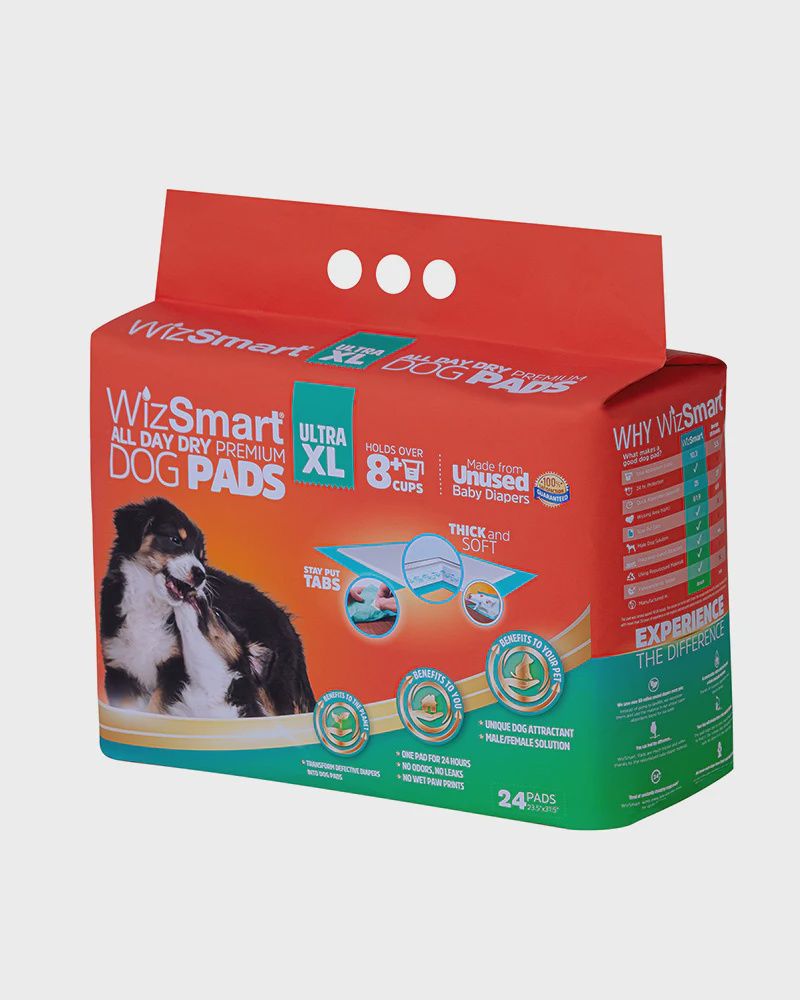 Train your pup with a premium-quality eco-friendly pee pad with WizSmart! WizSmart is an independent company that provides your pet with quality environmentally-friendly pee pads that are super absorbent. Each pad is square with sealed edges to quickly trap both liquids and unwanted odors. Unique repurposed fluff material made from eucalyptus and recycled unused baby diapers and other eco-friendly materials can hold up to 8 cups of liquid. Features safe pet-friendly dog attractant for training both puppies and senior dogs. Each pad also has 4 patented "Stay Put Tabs" to secure the pad to the floor and protect your furniture, floors, and walls. The adhesive strips also allow you to secure the pad to the wall at a 90-degree angle to provide a natural male dog peeing stance. Great for puppy training, travel, senior dog incontinence, and more. WizSmart saves over 240 million unused diapers every year, repurposing them for their unique super absorbent pads. Good for your pup and the planet! Made in USA.